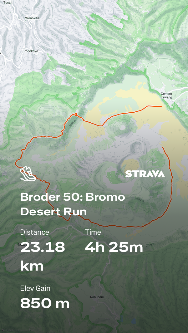 - 맺음말. 메달을 못 받았지만 후회는 없습니다. 레이스 중 브로모 화산 국립공원의 경치를 충분히 즐겼고, 많은 사진과 동영상을 남겼습니다. 저는 이게 꽤 값지게 느껴집니다. 다음에 트레일런을 참가한다면 업힐/다운힐 훈련 또는 주기적인 등산을 좀 해 놓아서 쥐가 나는 일을 없애야겠다고 생각했습니다.